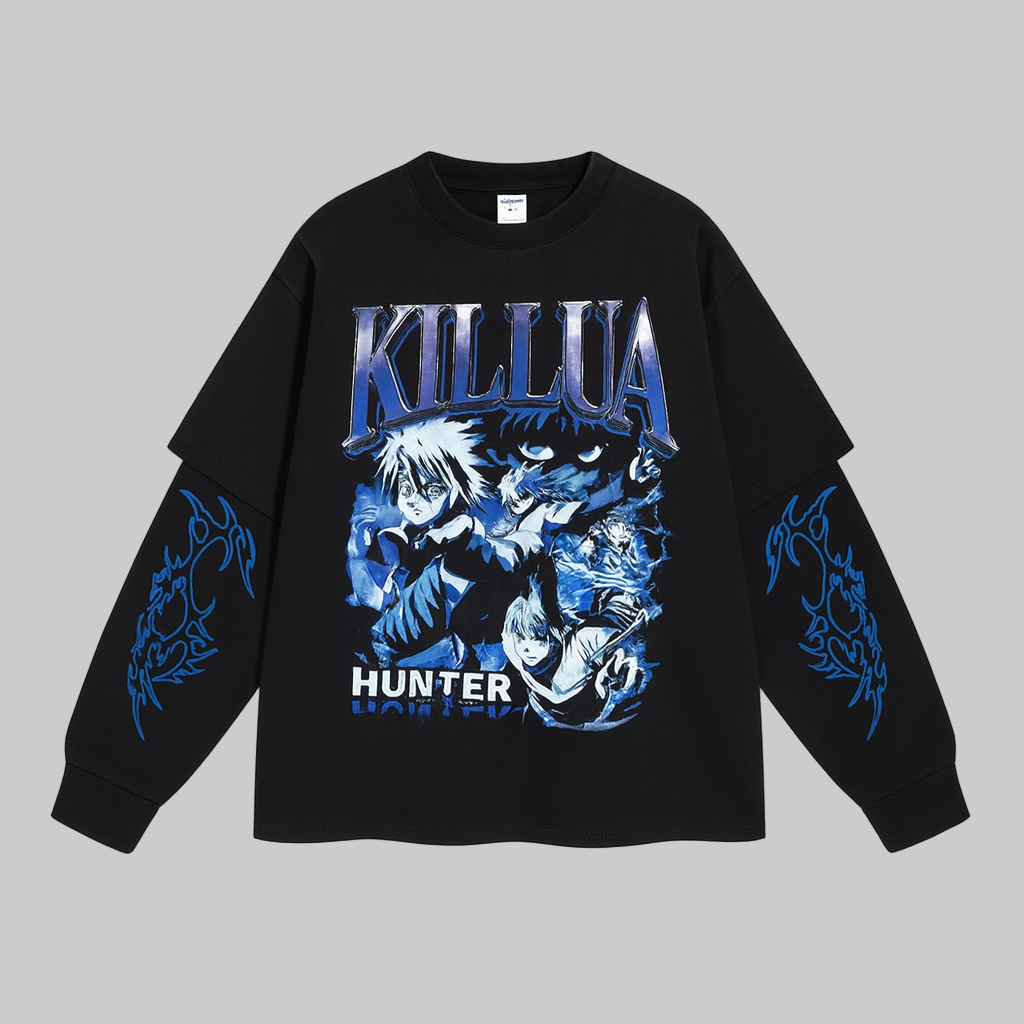 Step into the world of Hunter x Hunter with the Killua – Thunderborn Chaos Long Sleeve Tee, a bold oversized piece built for anime lovers and streetwear addicts.