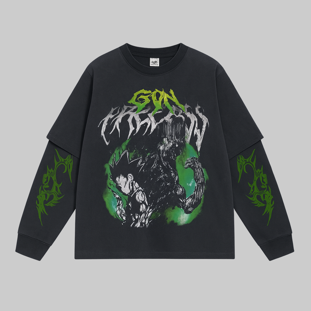 This oversized long sleeve tee captures one of the most intense transformations ever animated. The design features Gon in Berserk form, illustrated in a chaotic, distressed style with neon green aura bursts and rough, jagged typography.